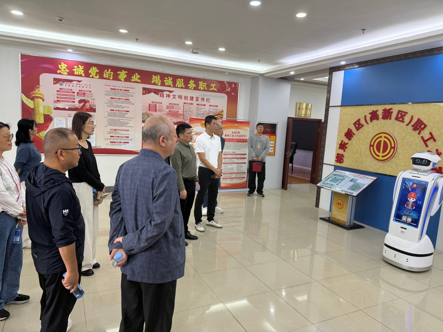 昆山市总工会考察组在柳东新区(高新区)总工会经费审查委员会主任麦爱文和工会智能机器人“工小慧”的引领和讲解下,相继参观了职工健康服务中心、职工劳动?;づ嘌抵行摹⑵古仪蚴液徒∩矸康确裾蟮?。详细了解了花岭职工之家的服务设施和服务举措,考察团对柳东新区(高新区)总工会举办的文体活动和竞赛给予了充分肯定,为花岭职工之家服务阵地的后续优化建设鼓舞信心。