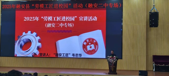 2025年12月15日下午,融安县“劳模工匠进校园”系列活动迎来融安二中专场——“融安工匠”、众诚德系汽车维护中心创始人韦志华走进校园,为近千名16岁左右、正处青春迷茫与梦想萌芽期的高中生,带来一堂以“以匠心守初心,以劳动筑梦想”为主题的劳动教育课,用亲身奋斗故事为青春赛道上的学子点亮方向。