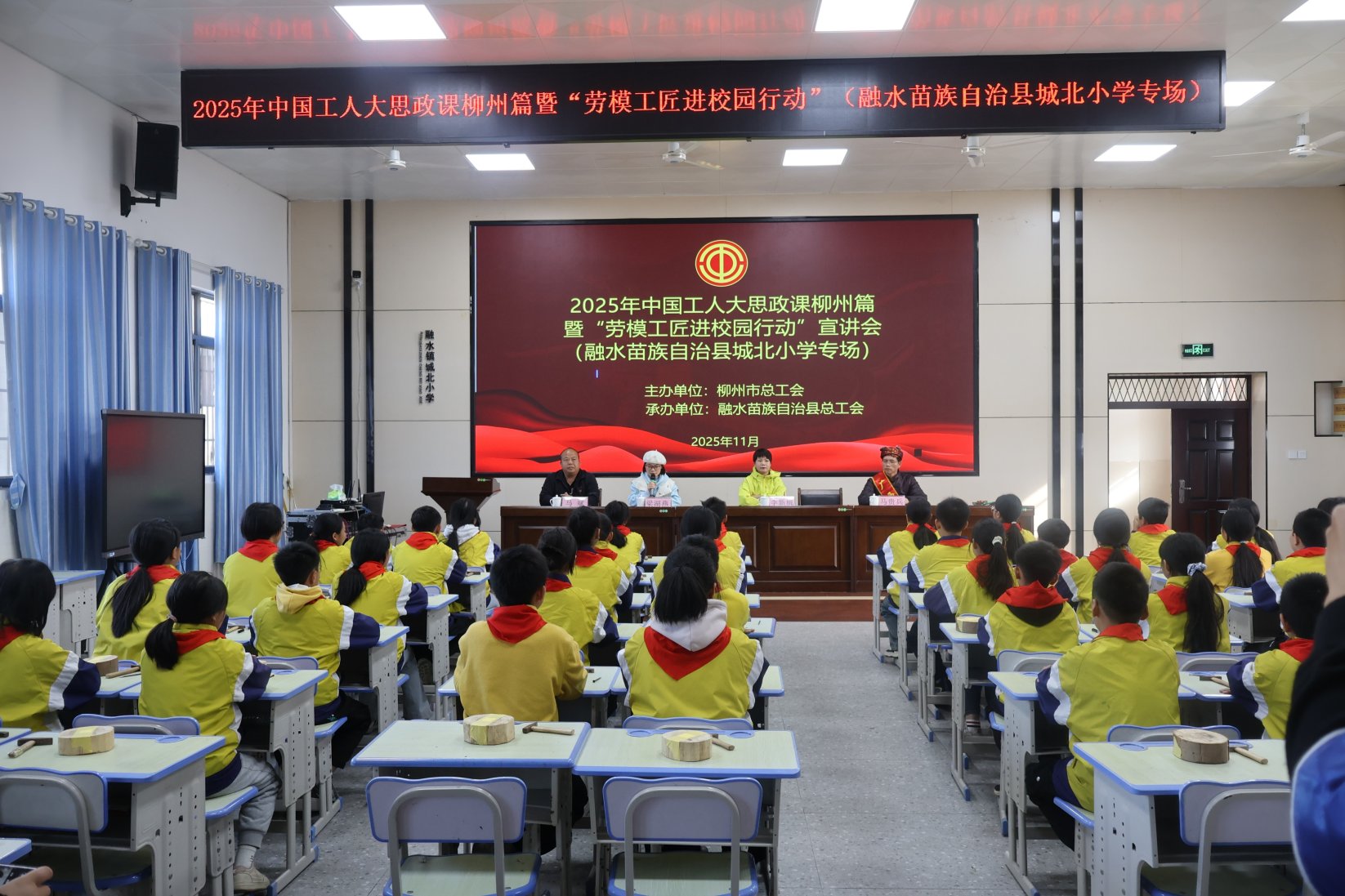 为传承中华优秀传统文化,弘扬劳模工匠精神,11月27日下午,2025年中国工人大思政课柳州篇暨“劳模工匠进校园行动”宣讲会走进融水镇城北小学。