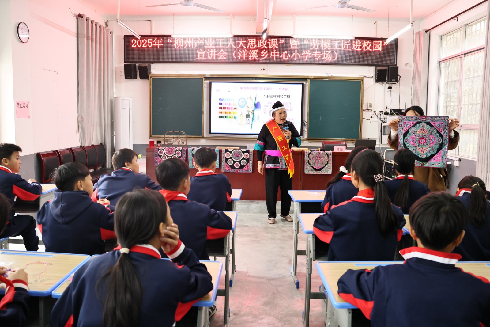 11月12日上午,2025年“柳州产业工人大思政课”暨“劳模工匠进校园”宣讲会在三江侗族自治县洋溪中心小学温情开讲。自治区非物质文化遗产项目代表性侗族刺绣传承人、“广西工匠”杨甜带着刺绣教具,为全校师生带来一场兼具精神感召与文化浸润的宣讲。