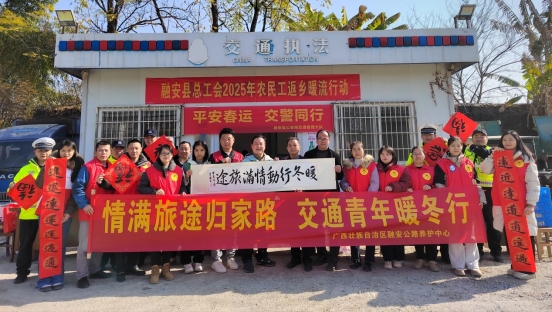 1月14日正值春运首日,融安县总工会联合县公安局交通管理大队、县交通运输局、团县委、县禁毒办,在209国道“春运爱心驿站”开展“文明暖心·新春送福联”“农民工返乡暖流行动”系列活动,为返乡农民工提供暖心服务,并送上新春的祝福。