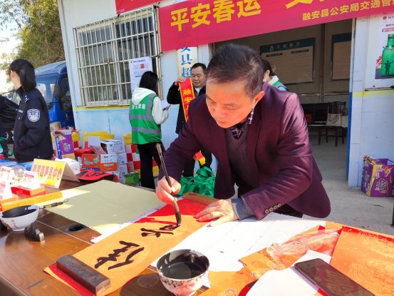无联不成春,有联春更浓。活动当天特邀广西五一劳动奖章获得者、县书法家协会志愿者韦昌海及多位书法爱好者现场挥毫泼墨,为返乡农民工书写春联和“?!弊?。现场洋溢着喜庆祥和的氛围。拿到春联的返乡农民工个个喜笑颜开,纷纷表示:“手写的春联更有年味,也让我们感受到了工会的温暖和关怀。”