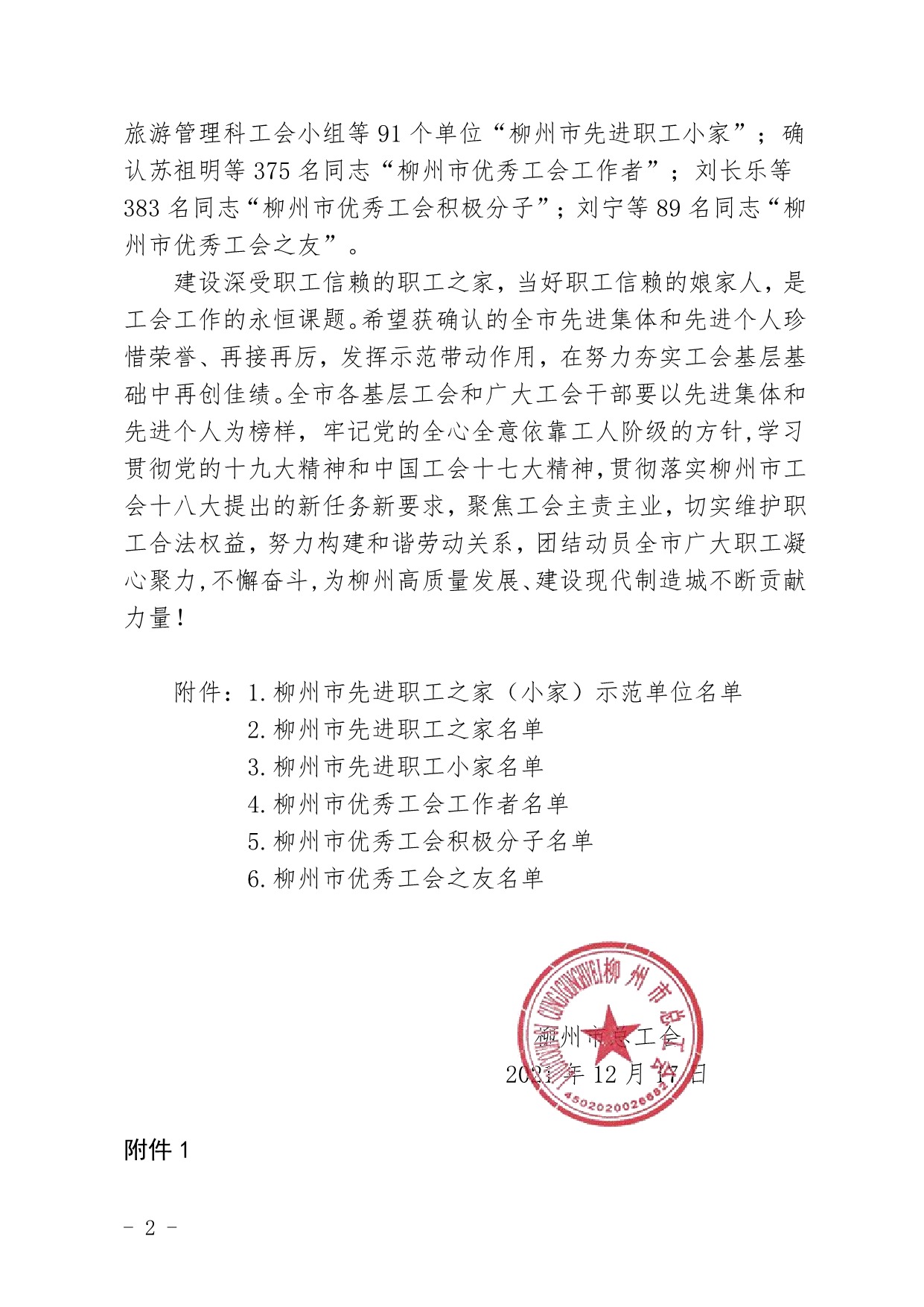 关于确认2021年度柳州市先进职工之家、先进职工小家和柳州市优秀工会工作者、优秀工会积极分子、优秀工会之友结果的通报