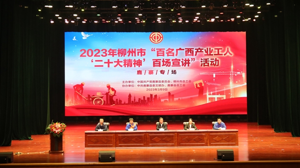 鹿寨讯 为深入学习宣传贯彻党的二十大精神,进一步推进产业工人队伍建设改革,强化全县广大职工群众思想政治引领,3月9日上午,2023年柳州市“百名广西产业工人‘党的二十大精神’百场宣讲”活动(鹿寨专?。┰诼拐幕帐踔行拇缶缭壕傩?。柳州市人大常委会副主任、党组副书记、市总工会主席梁日春,鹿寨县四家班子领导、县直各单位领导、企业负责人、各级劳模工匠代表、一线职工代表、学生代表等500多人到场聆听。